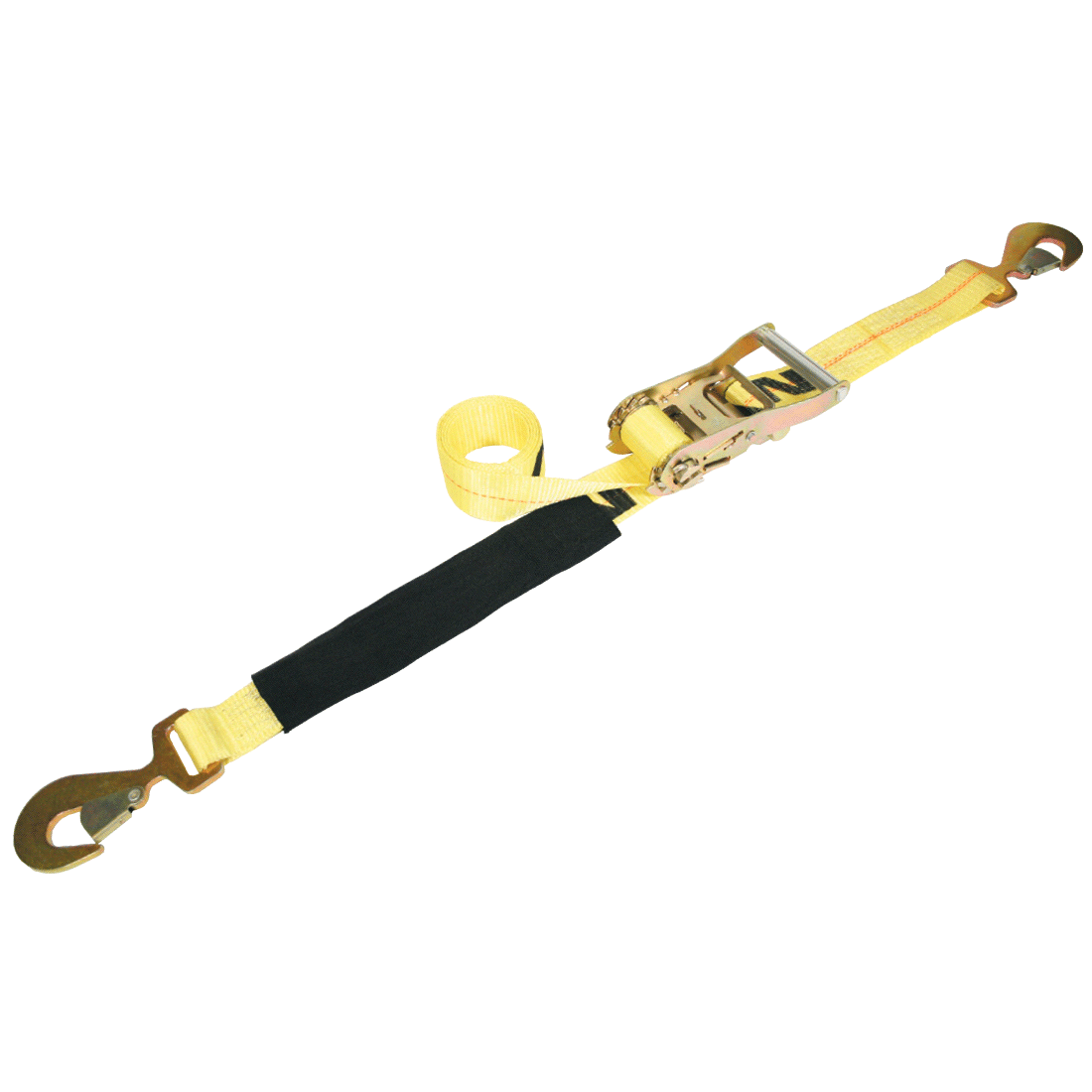 - Heavy duty 2'' yellow webbing is cut and UV resistant, and ratchet buckles and snap hooks are plated for maximum weather resistance