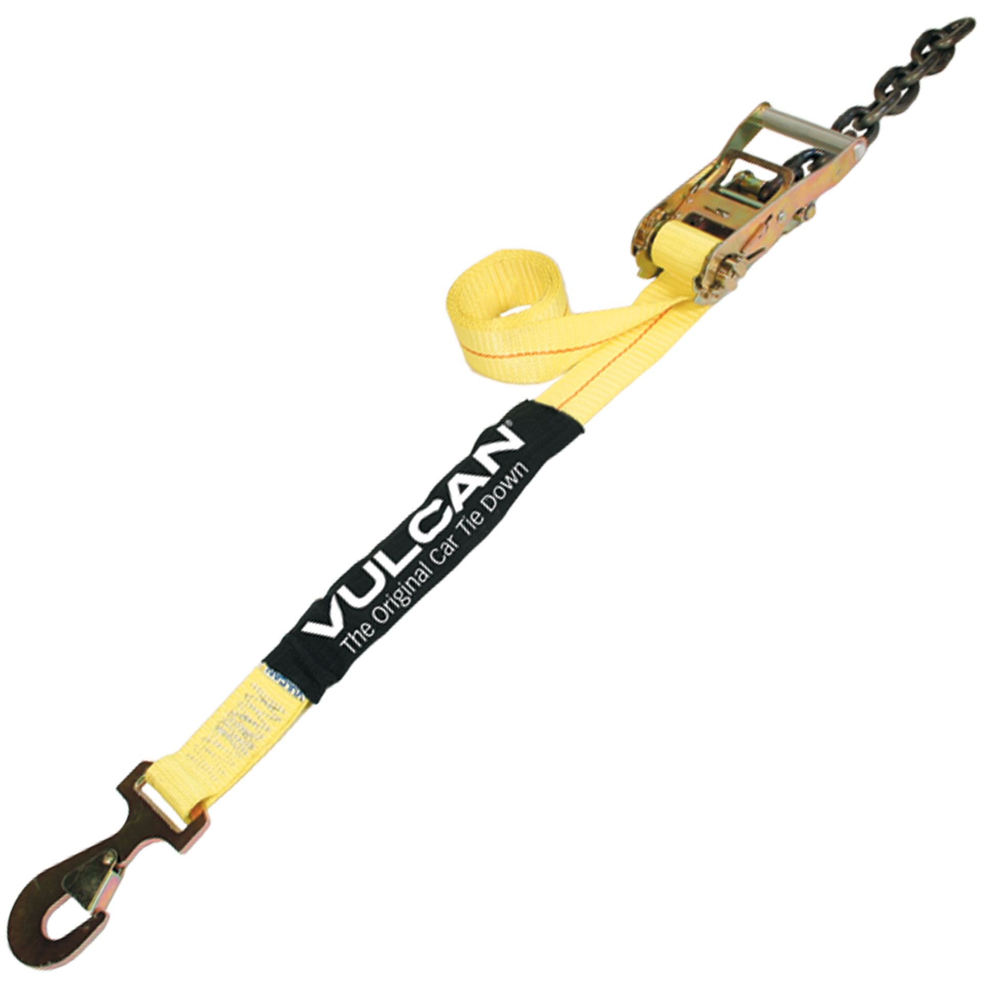 - Heavy duty 2'' yellow webbing is cut and UV resistant, and the ratchet buckle has a 5/16'' x 12'' chain tail that fits into the t-slot, banjo eye or grab hook on your trailer deck