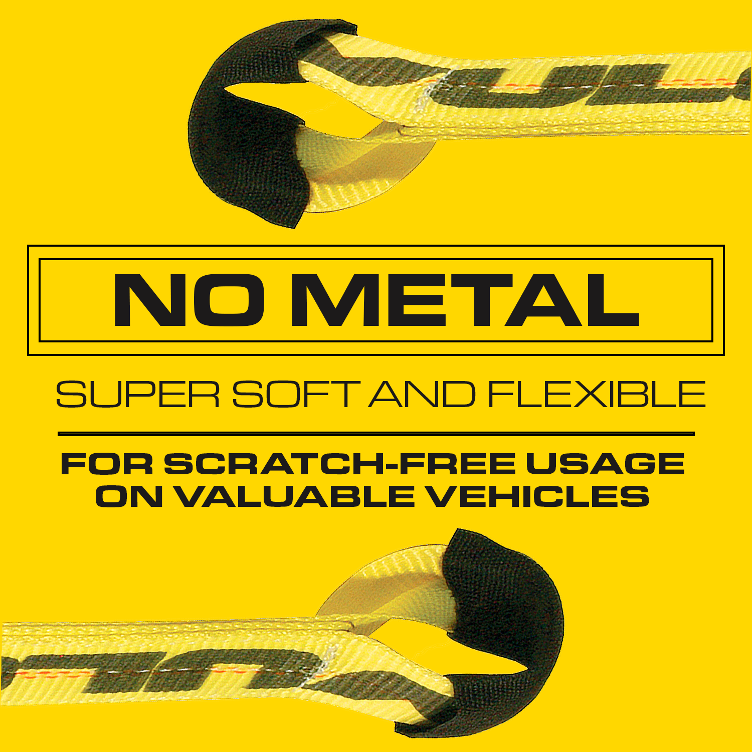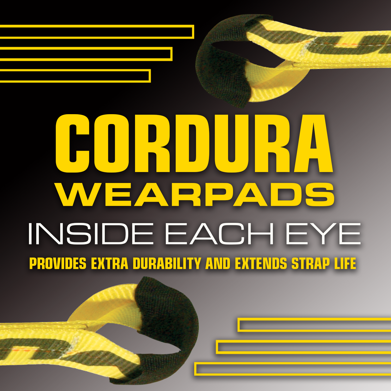 - HEAVY DUTY TIE DOWN WEBBING - Flexible 2 in. wide yellow tie down webbing provides excellent durability and long service life. Cordura wear pads are placed inside each eye for durability, and the soft, flexible design and soft eyes provide scratch free usage on valuable vehicles.