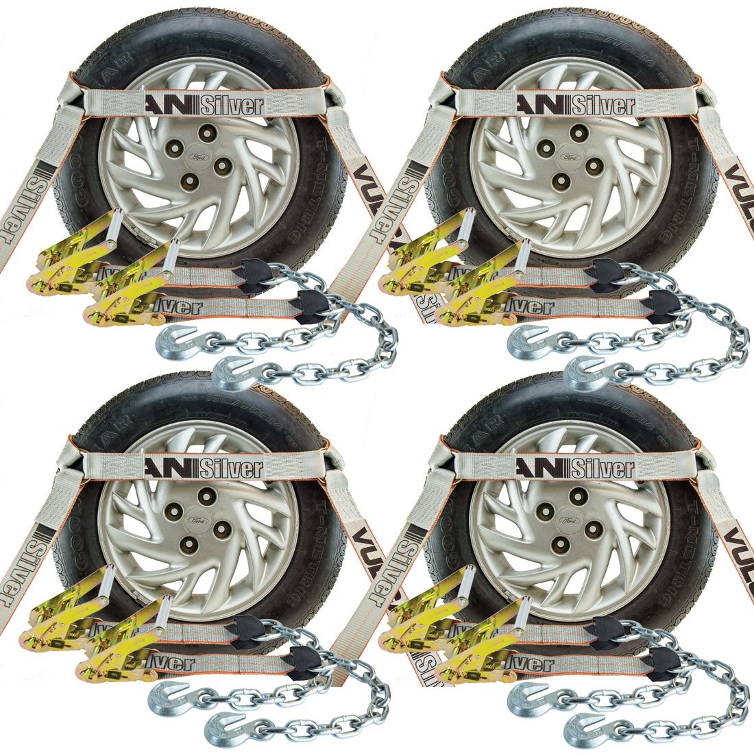- UNIQUE SILVER SERIES WEBBING - The heavy duty 2'' Silver Series tie down webbing provides excellent durability and long service life, and each strap features two ratchet buckles with 3/8'' x 12'' chain anchors for extra strength and a secure connection to D rings, side rails, grab hooks or stake pockets.