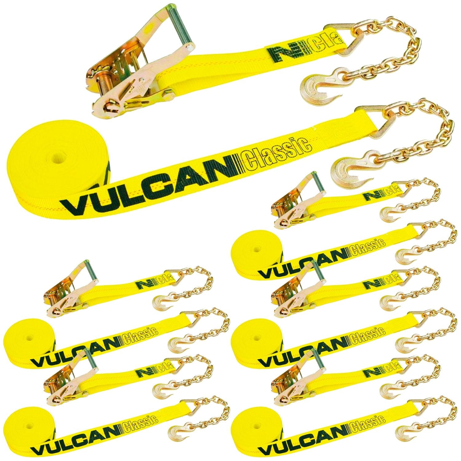 VULCAN Ratchet Strap with Chain Anchors - 2 Inch x 27 Foot - 6 Pack - Classic Yellow - 3,600 Pound Safe Working Load