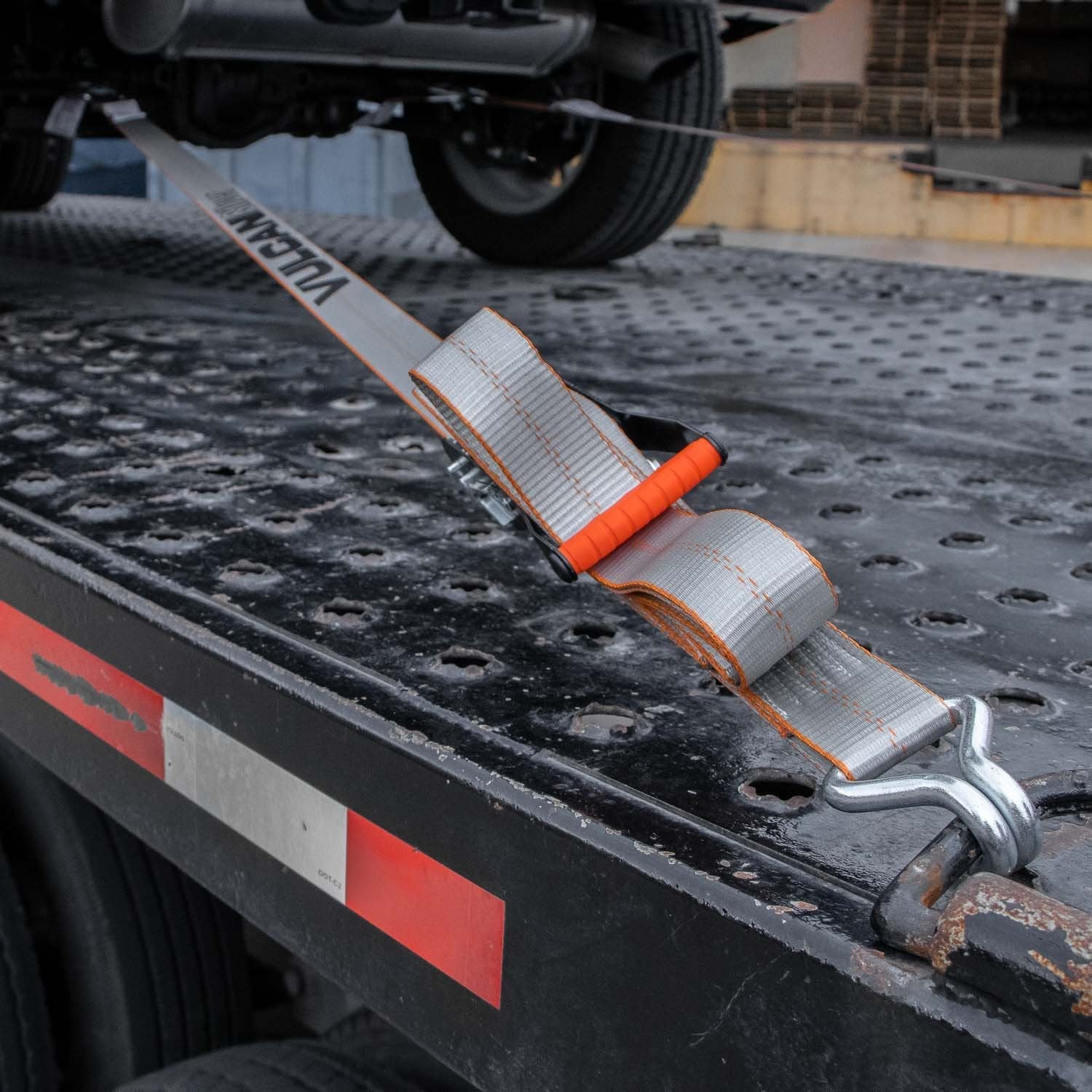 - PROFESSIONAL GRADE TIE DOWNS - Professional truck, trailer, and flat bed operators choose Vulcan cargo control systems to haul millions of loads every year. Vulcan is recognized as the most qualified, most experienced, cargo tie down manufacturer in the world. Work with confidence, knowing that this heavy duty ratchet strap is backed by the 50 years of manufacturing expertise that only Vulcan can provide.