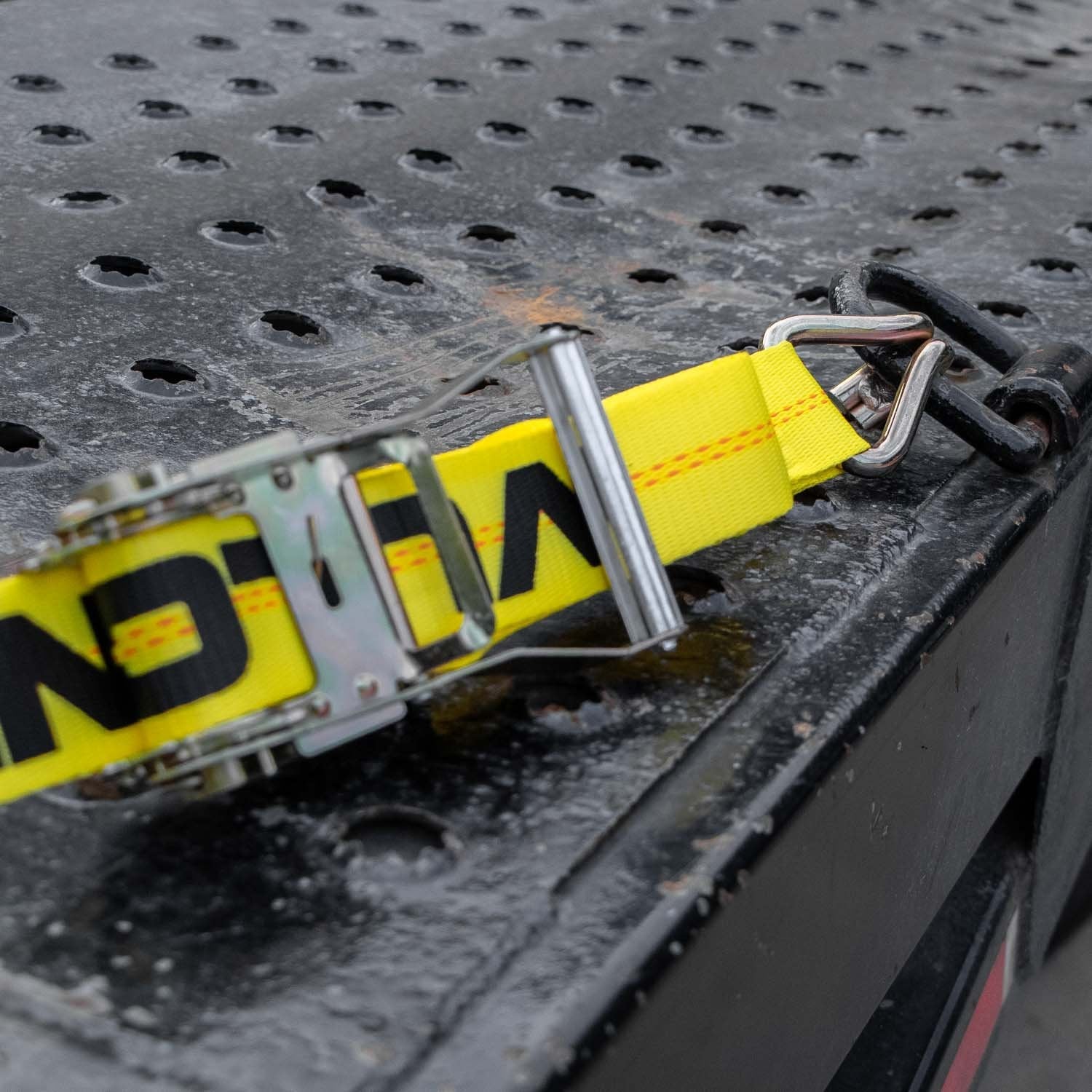 - INDUSTRIAL STRENGTH COMPONENTS - This strap features a heavy duty steel wide handle ratchet, a hook on both ends for secure tie down on both sides of your load, and coated end fittings for weather resistance.
