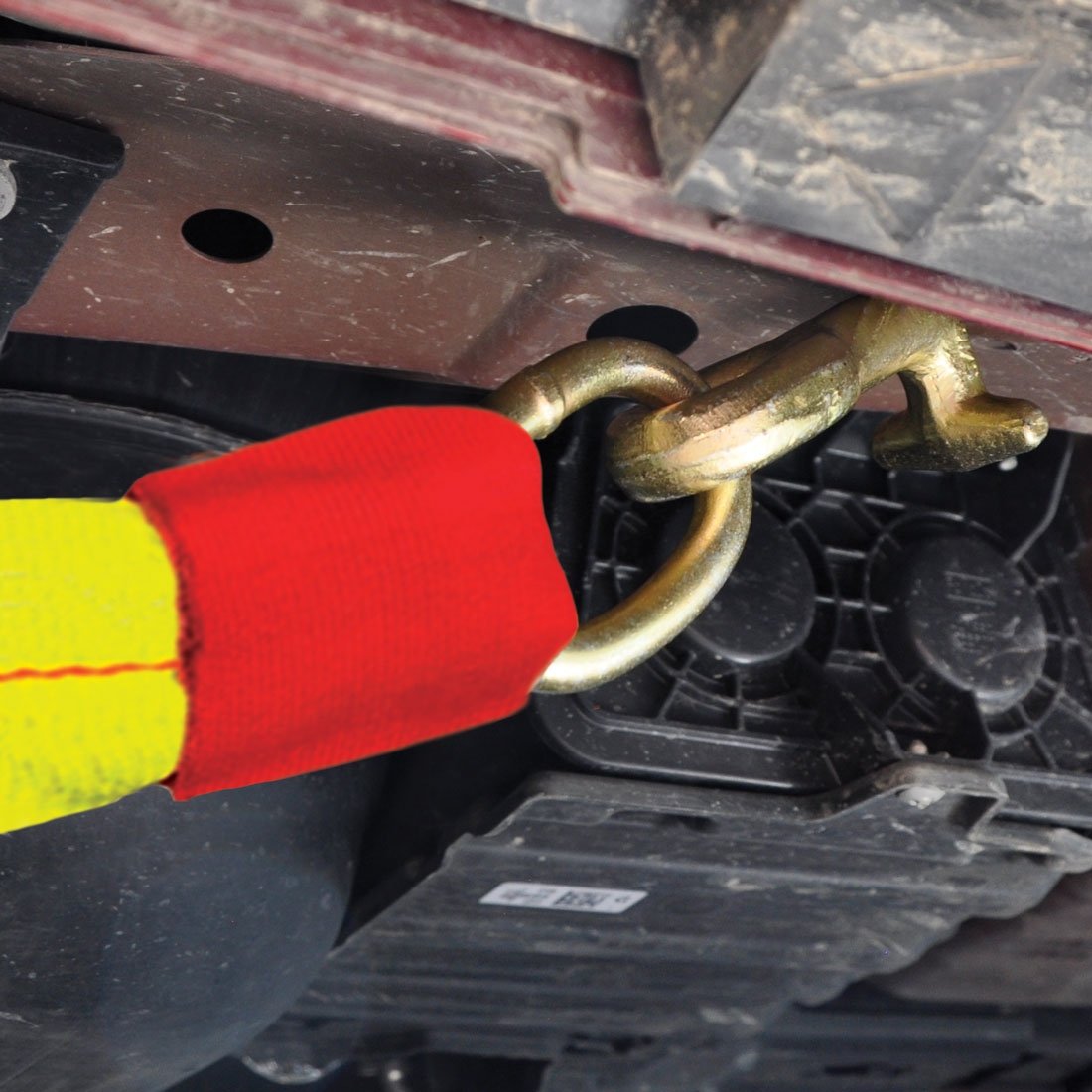 - INDUSTRIAL STRENGTH COMPONENTS - The hooks and D rings are plated for maximum weather resistance, and wear pads are sewn inside of the webbing eyes for even more durability under harsh towing conditions. The strap contains over 7 feet of webbing, sewn 3-ply, and has an overall reach of 47 inches from the inside of the master ring to the cradle of the hook.