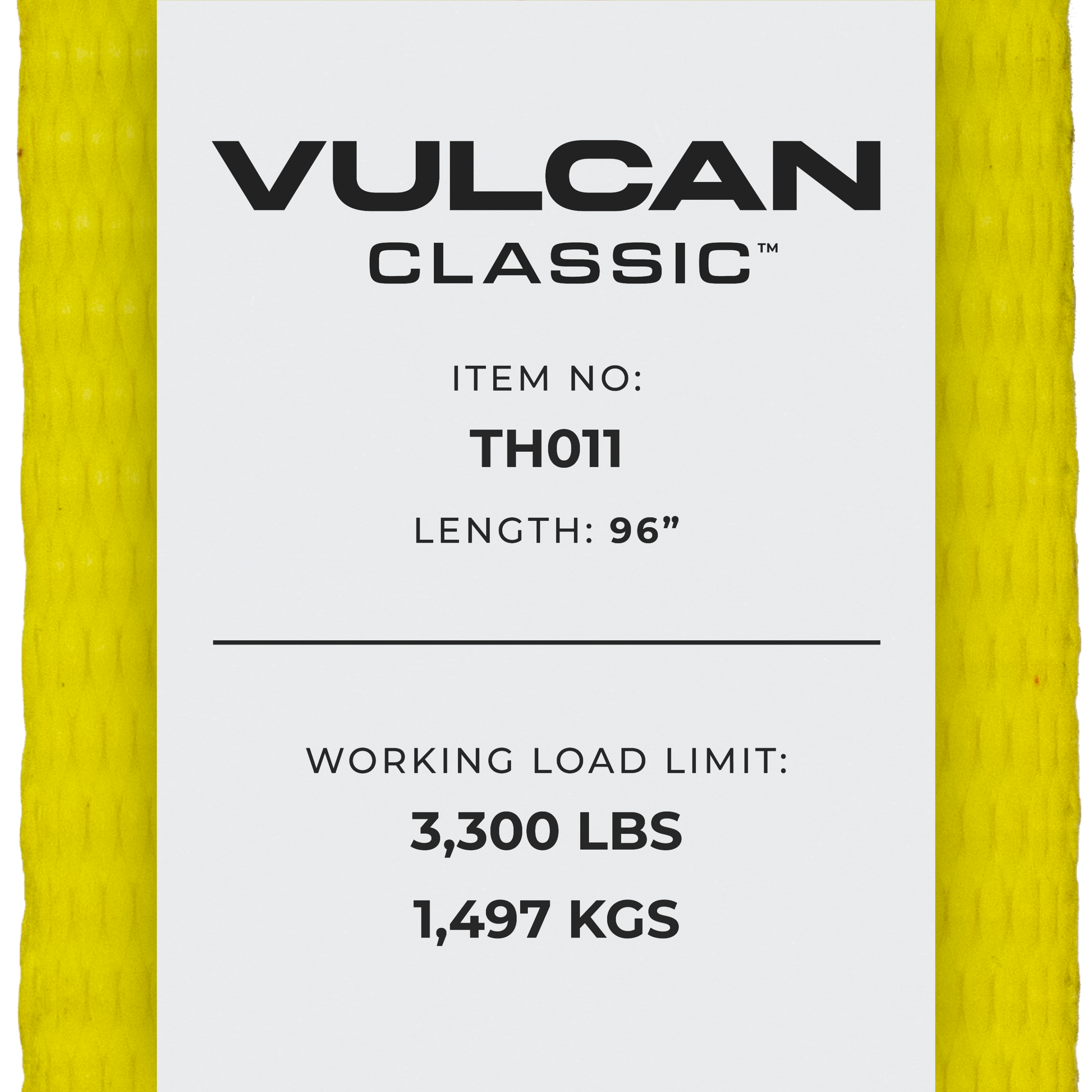 - YELLOW VULCAN WEBBING - Heavy duty 2'' x 96'' tie down webbing is cut and UV resistant, and the strap features a plated O-ring and a cordura wear pad for maximum security and minimum rim damage.